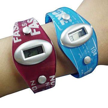 素材はソフトPVC、LCD時計、ベルトにオリジナルデザイン印刷